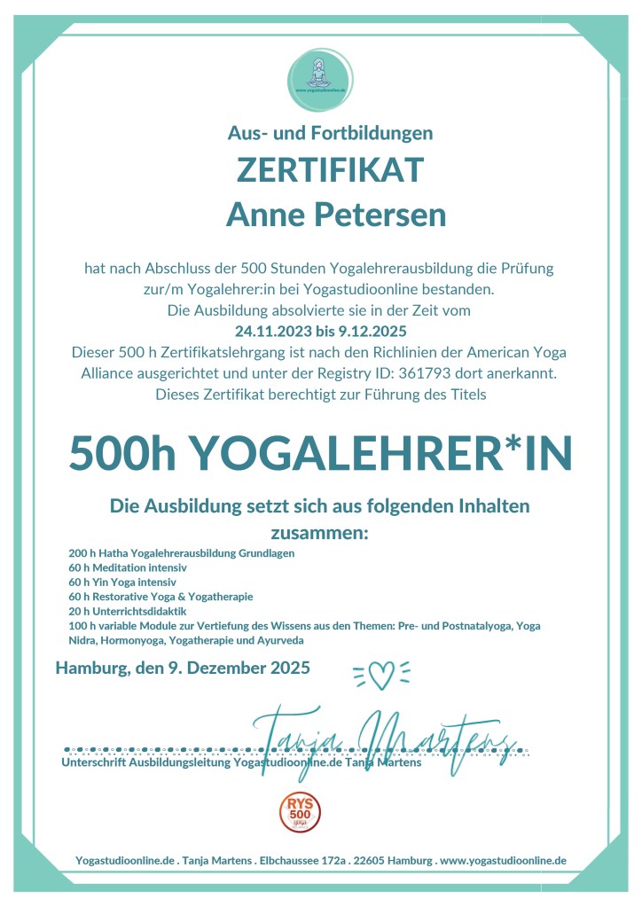 ich bin Anne Petersen. Eine waschechte Nordfriesin, meine Muttersprache ist Plattdeutsch. Ich kann von mir behaupten, dass ich genau das Leben führe, das ich gerne führen würde. Diese Einstellung verdanke ich zum größten Teil dem Yoga.